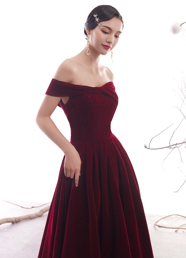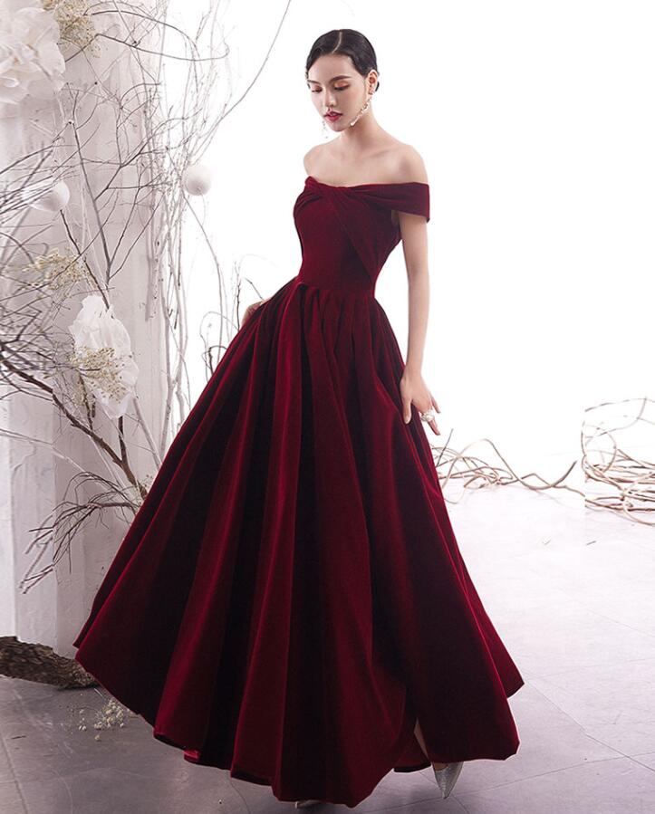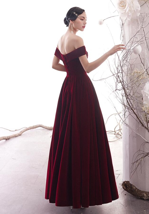 A Line Burgundy velvet long prom dress formal dress