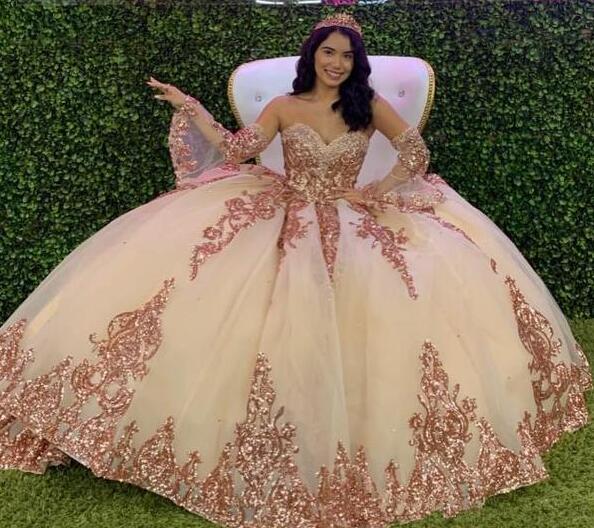 Vintage Sweetheart Rose Gold Sparkly Quinceanera Prom Dresses 2020 With Lace Applique Sequins Ball Gown Tulle Party Dresses