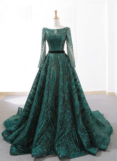Vintage Long Sleeve Dark Green Sequins Backless Prom Dress
