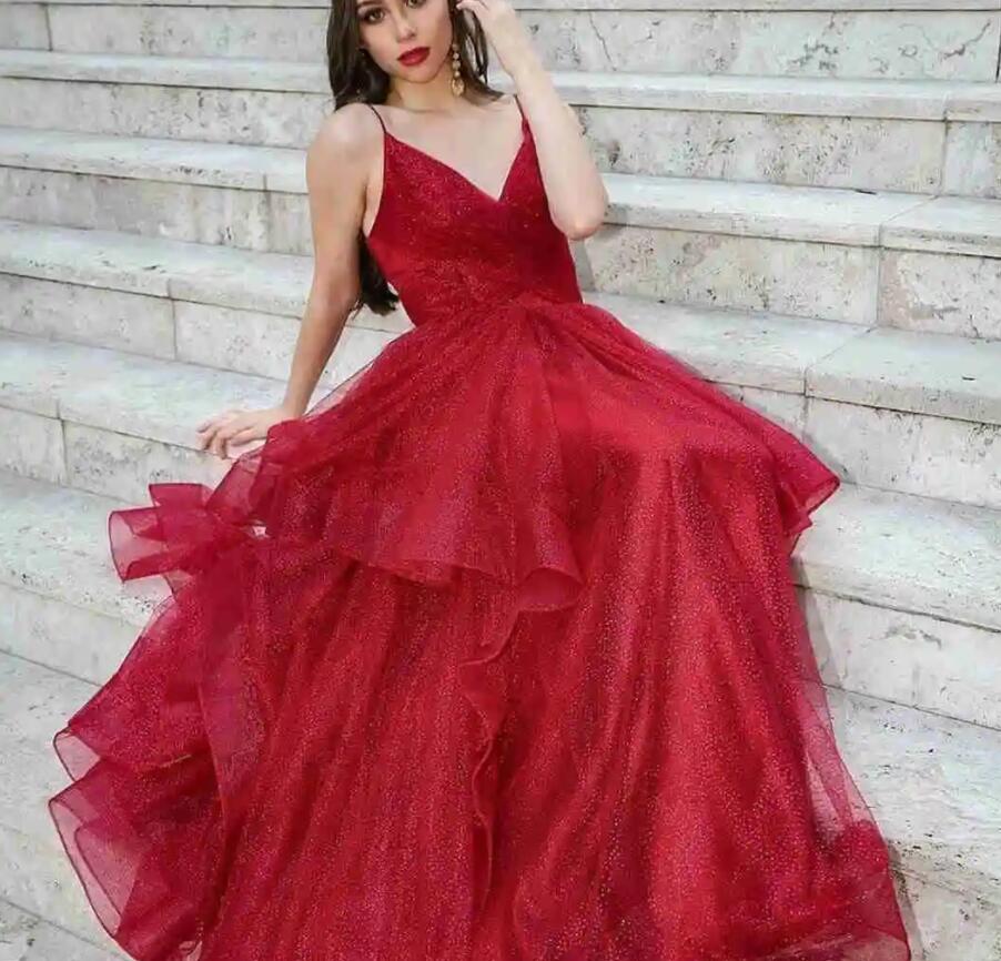 Sexy Glitter Straps V Neck Red Long Prom Dress Formal Dress