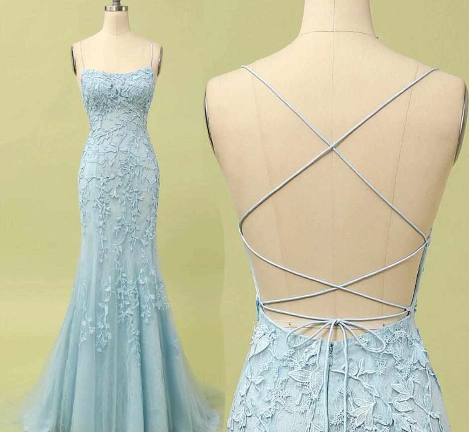 Beauty Mermaid Light Blue Lace Prom Dress Long Evening Dress