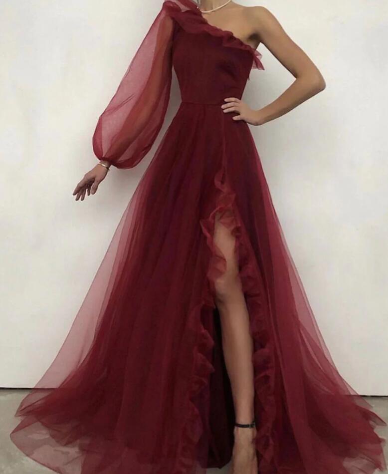 A line burgundy one shoulder tulle long prom dress