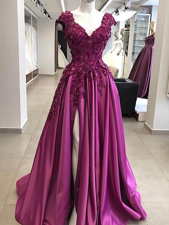 A-Line V-Neck Split Prom Dress With Lace Appliques