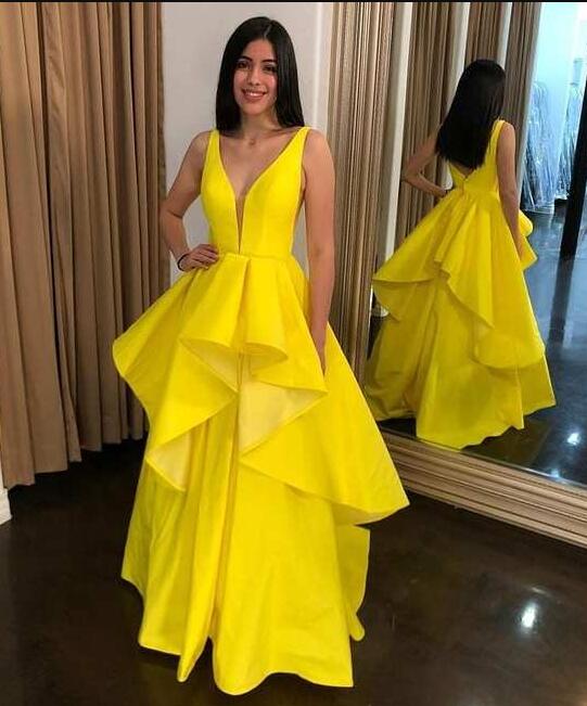 A-Line V-Neck Long Stain Yellow Prom Dress