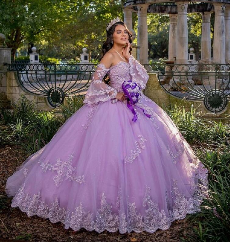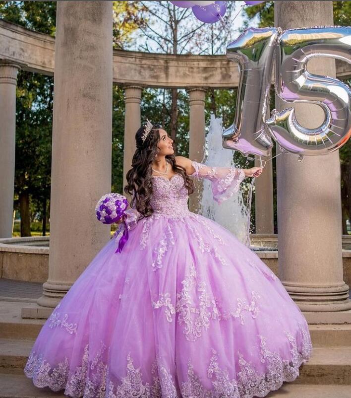 Charming Ball Gown Lavender Ball Gown Long Sleeves Quinceanera Dresses Lace Prom Gown