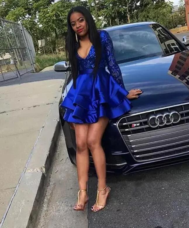 Royal Blue Sequins Satin Tiered Sequin Short Homecoming Dresses With Long Sleeves