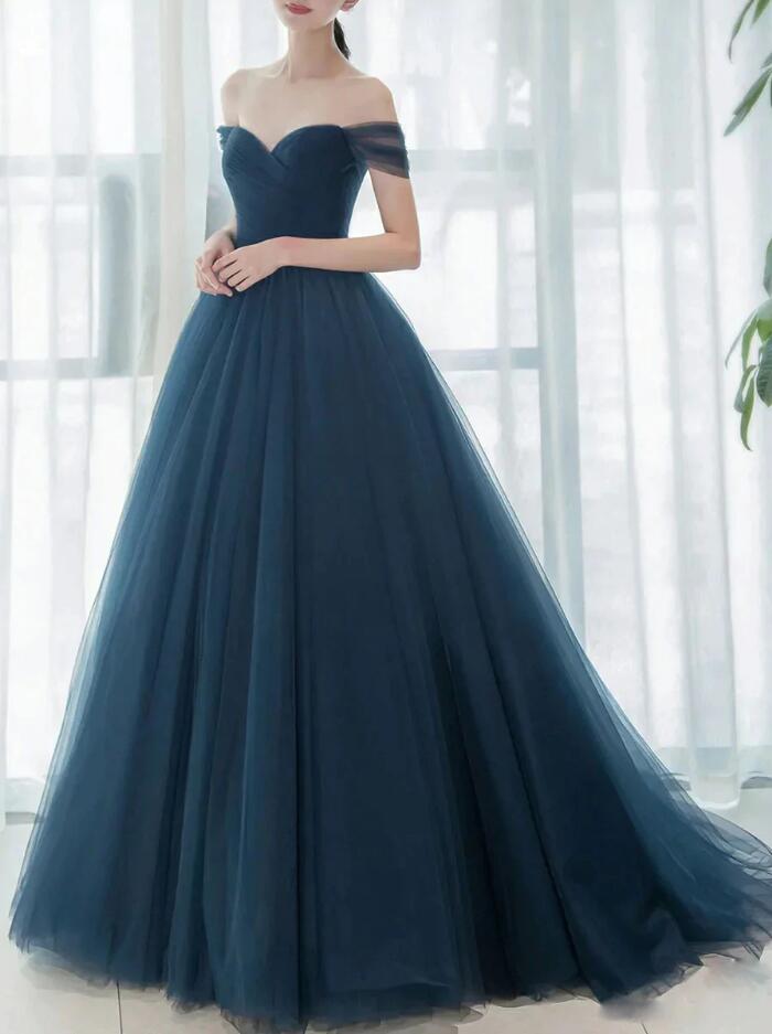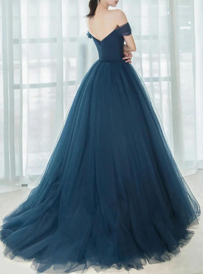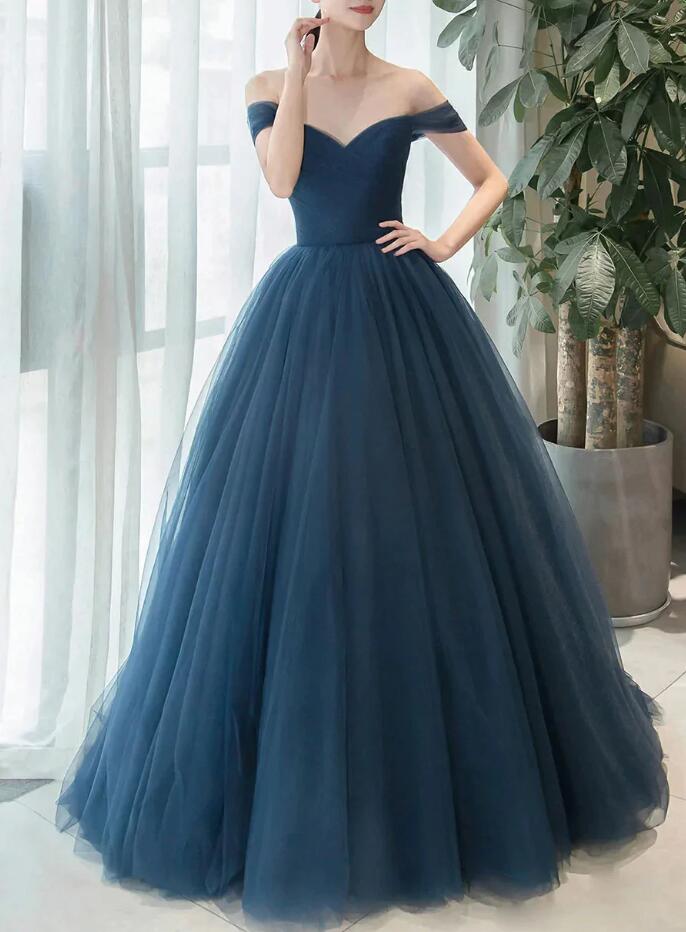Simple Off Shoulder Blue Tulle Long Sweep Train Prom Dresses