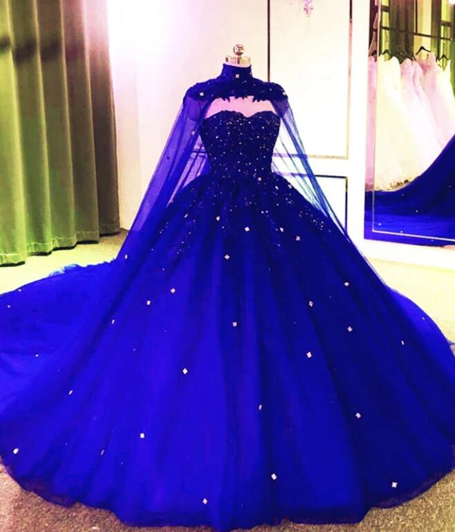 Mermaid Royal Blue Tulle Prom Dresses With Cape