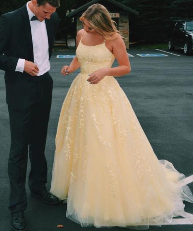 A Line Yellow Tulle Long Prom Dress with Lace