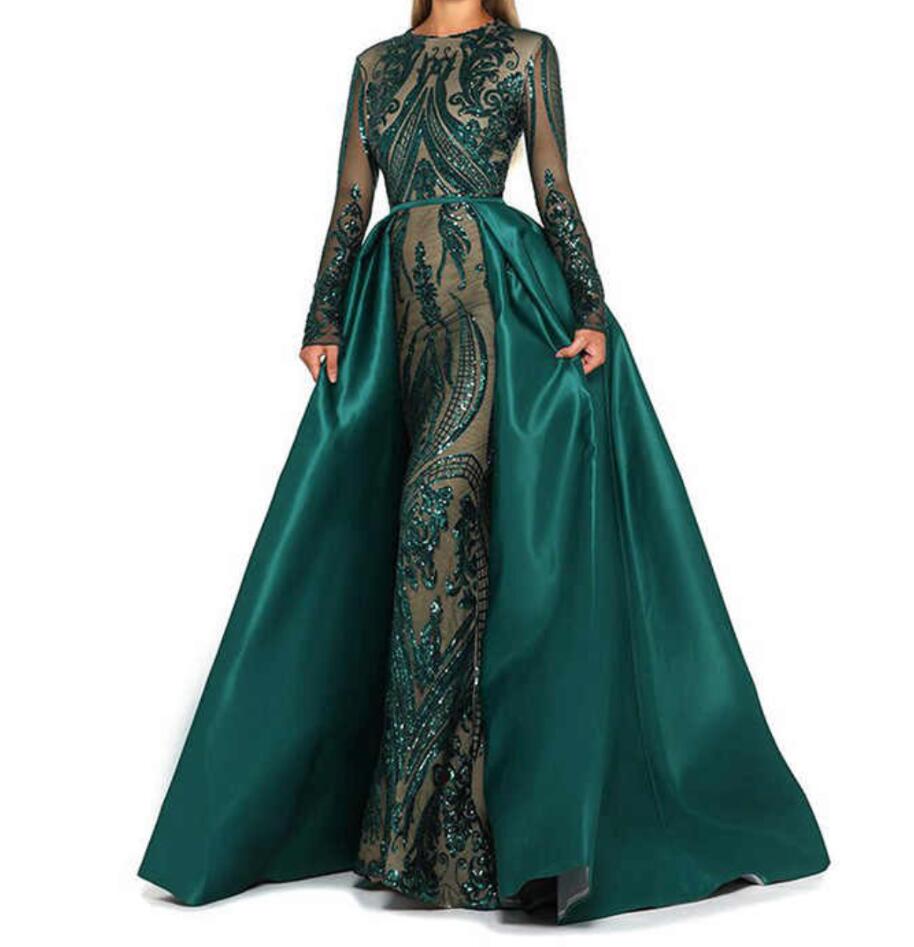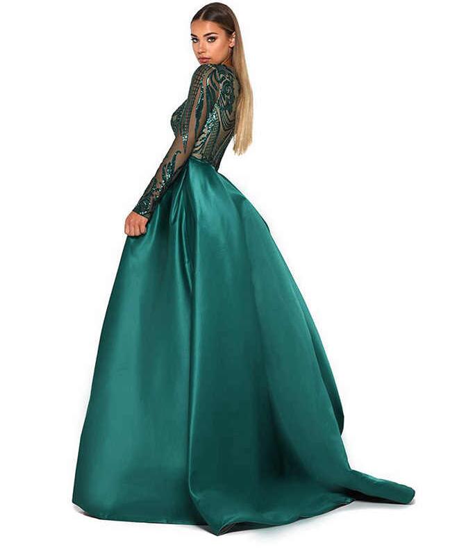 Sparkly Sequin Long Sleeve Detachable Train Emerald Green Prom Dresses