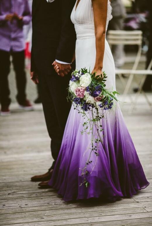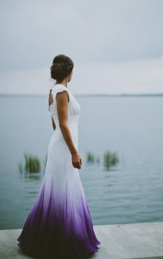 A Line Chiffon Purple Beach Wedding Dresses Ruched Lace Bridal Gowns