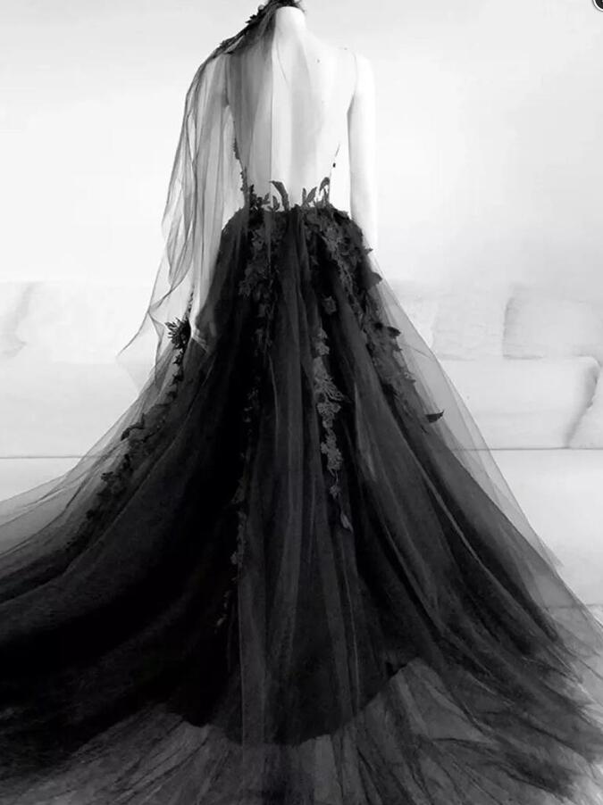 A Line Gothic Black Lace Tulle Backless Prom Dresses