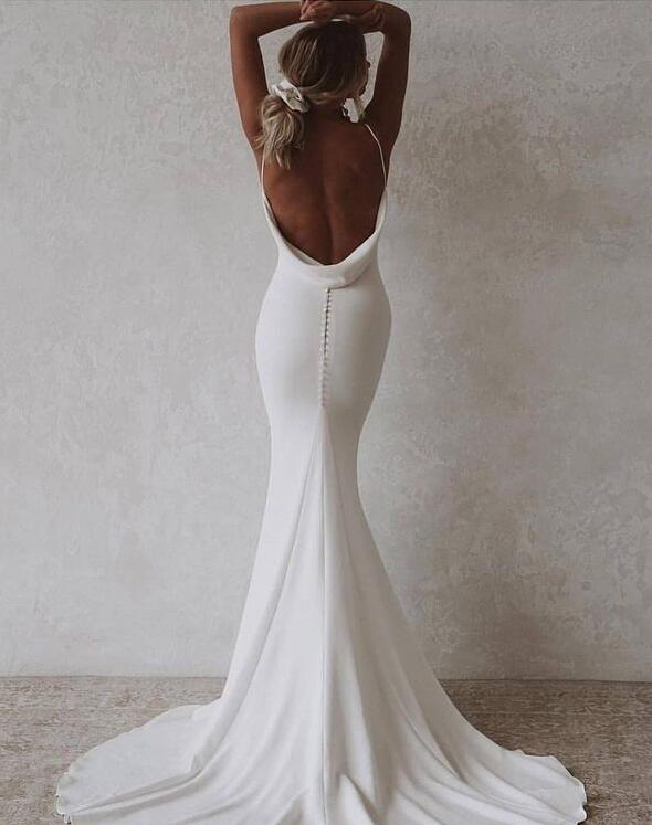 Simple Mermaid V Neck Backless Satin Bridal Gown Wedding Dresses