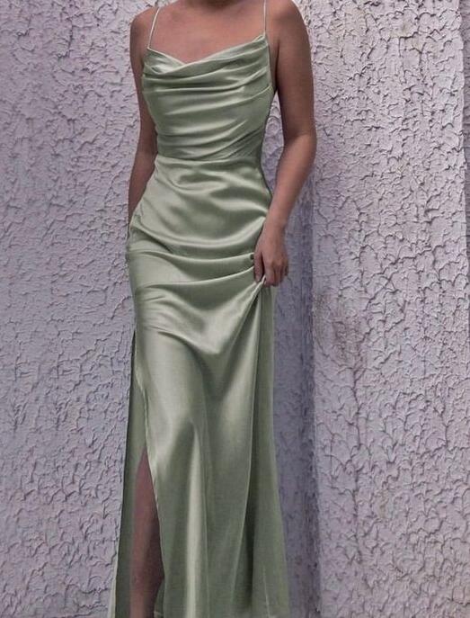 A Line Cowl Neck Sage Green Silk Satin Evening Dresses