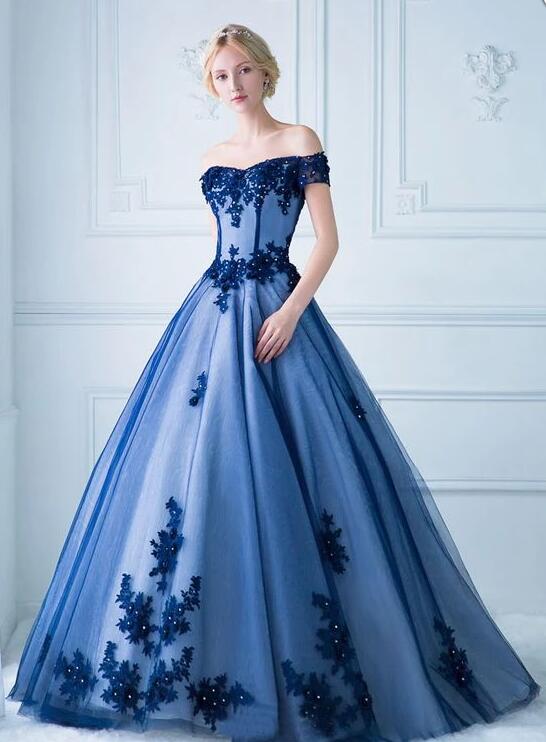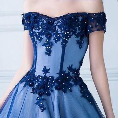 Elegant Off Shoulder Princess Blue Evening Dresses With Lace Applique