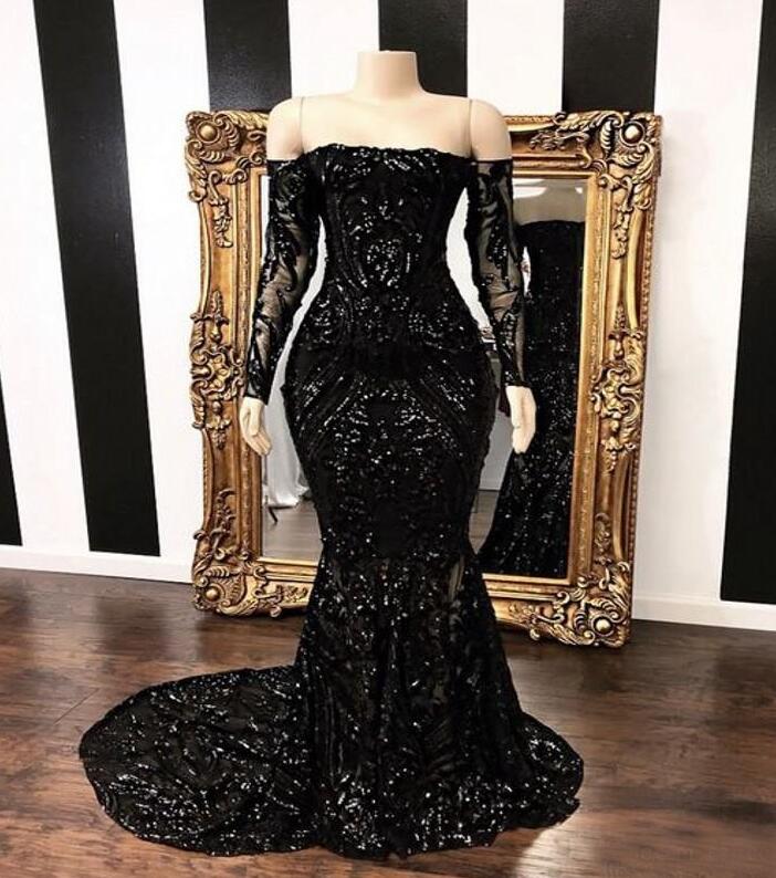 Off The Shoulder Black Mermaid Sequin Prom Dresses