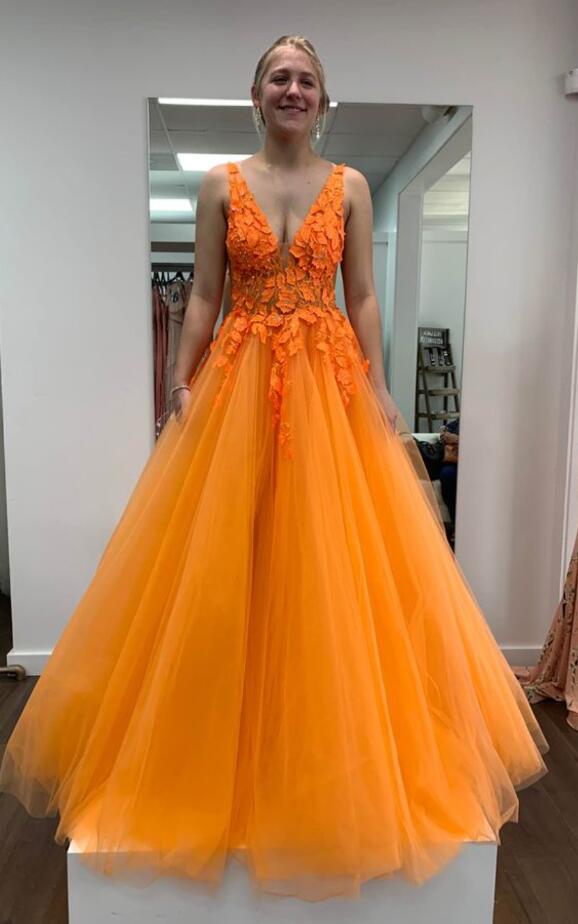 Elegant A-Line Orange Tulle Long Prom Dresses With Lace