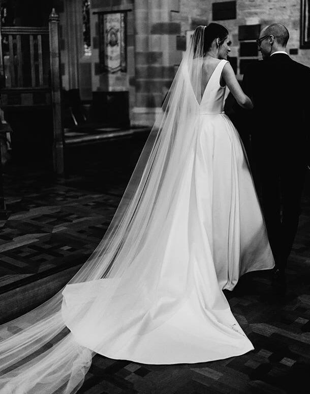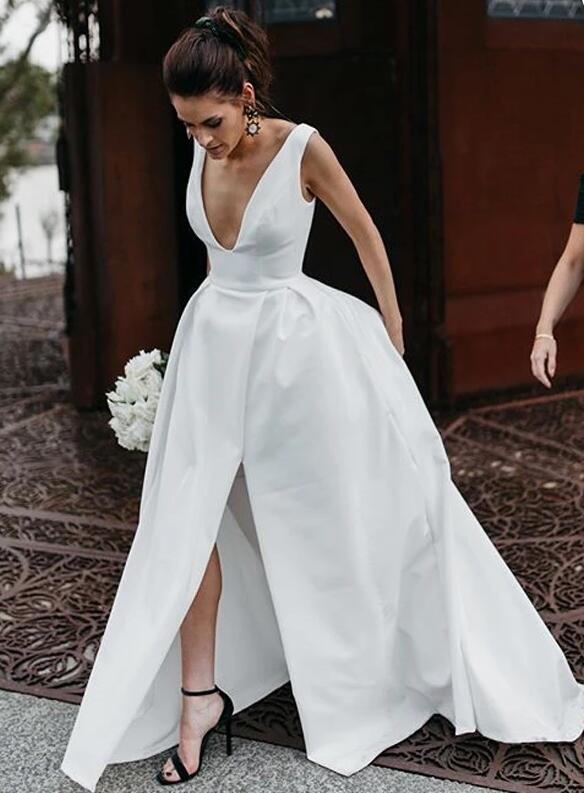 Elegant A-Line Satin V-Neck Slit Backless Bridal Dress