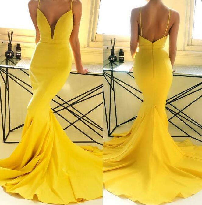 Spaghetti Strap Yellow V-Neck Zipper Prom Dress