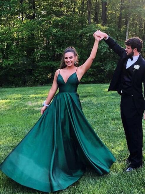 A Line V Neck Dark Green Long Prom Dresses Formal Graduation Dresses