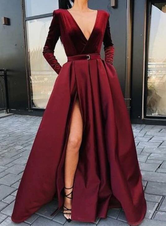 A-Line V-neck Floor-Length Burgundy Split Prom Dress with Pockets