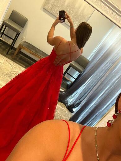 Straps Red Backless Lace Prom Dresses, Open Back Evening Dresses