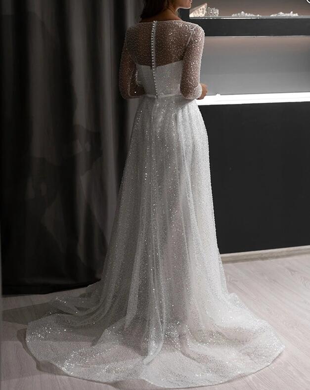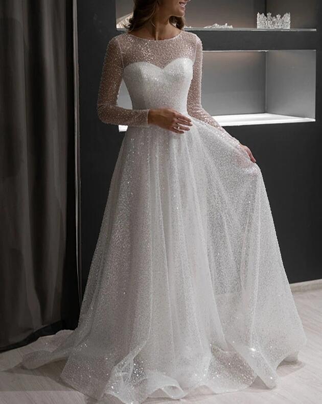 Mermaid Round Neck Sparkly Long Sleeves White Sequins Wedding Dresses