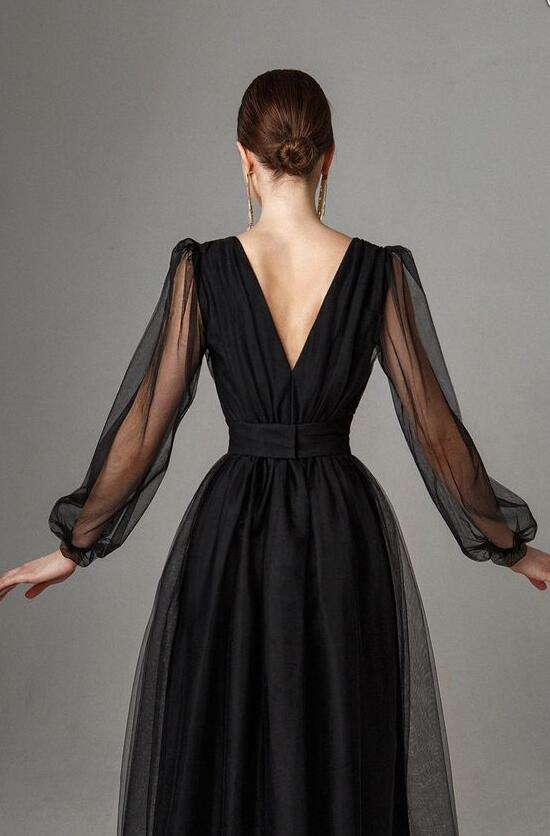 A-Line Long Sleeves V Neck Tea Length Black Prom Dresses