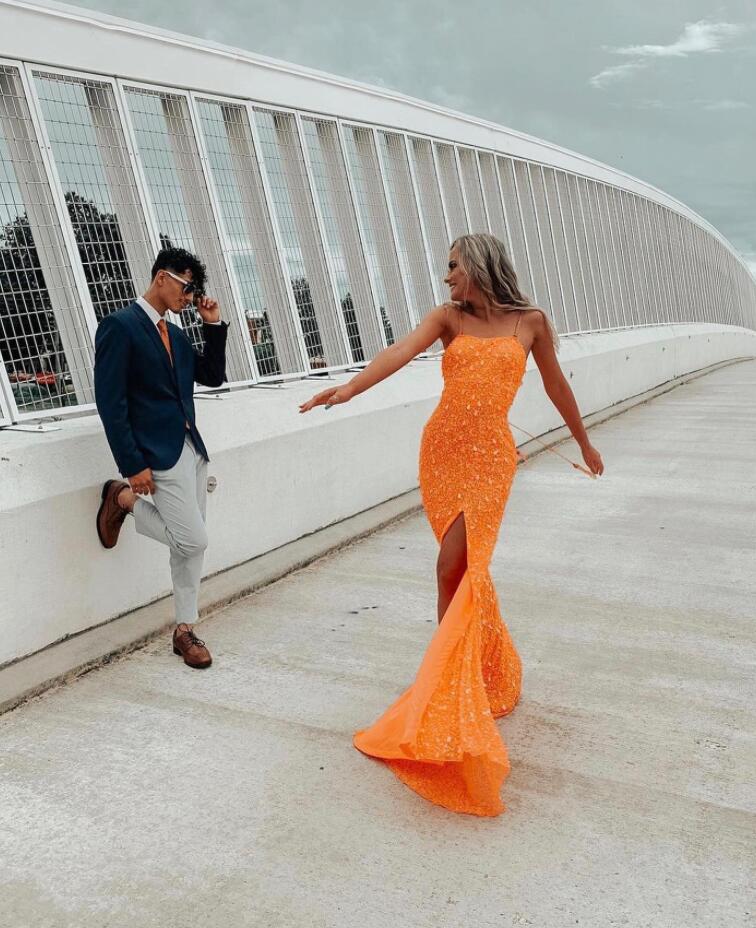 Spaghetti Straps Orange Sequins Long Prom Dresses with Side Slit