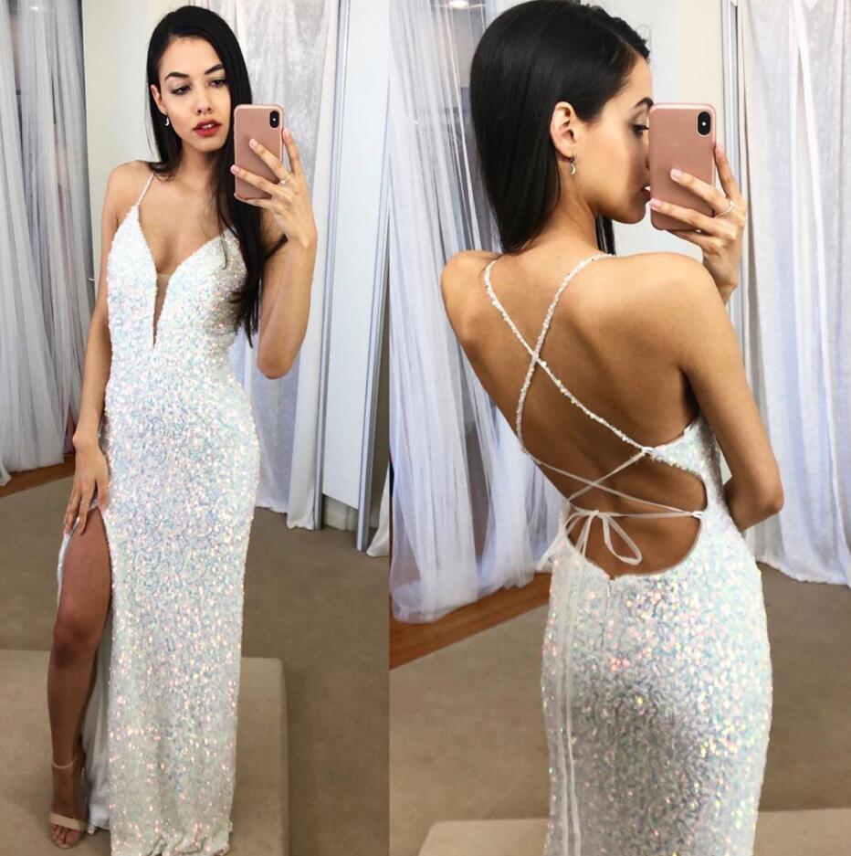 Mermaid V Neck Cross Back White Sequin Prom Dresses