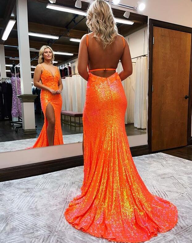 Spaghetti Straps Orange Sequin Long Prom Dresses with Slit
