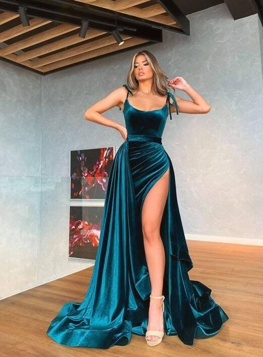 Mermaid Hunter Green Velvet Long Evening Dresses with High Split