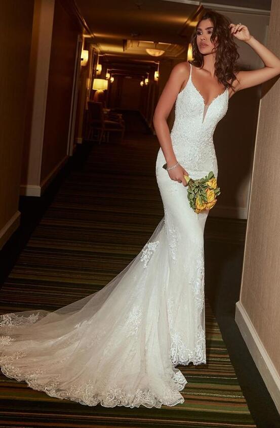 Sheath Mermaid V Neck Ivory Lace Wedding Dress