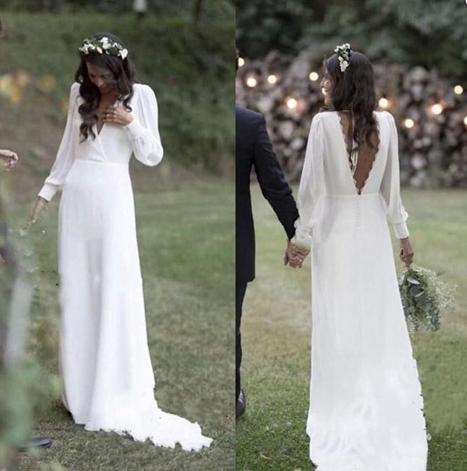 Simple Boho V Neck A Line V Back Wedding Dresses Bridal Gown