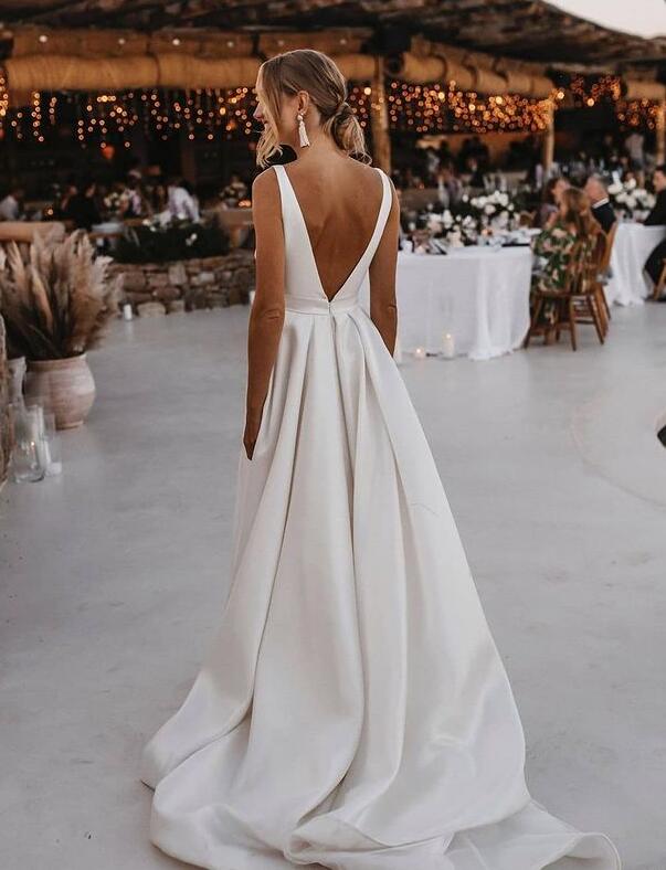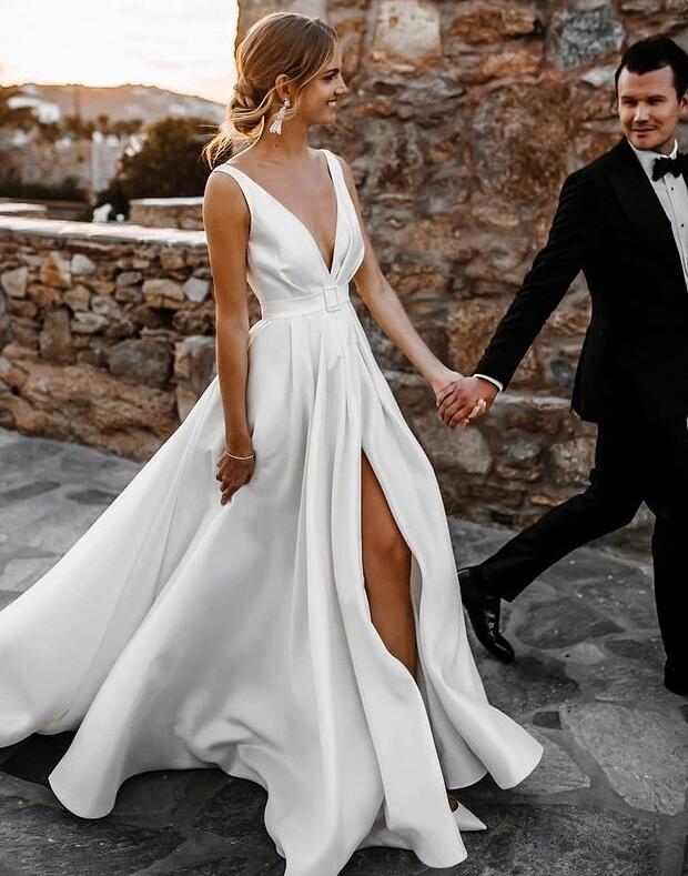Simple Fashion V Neck Satin Ivory Wedding Dresses with Split