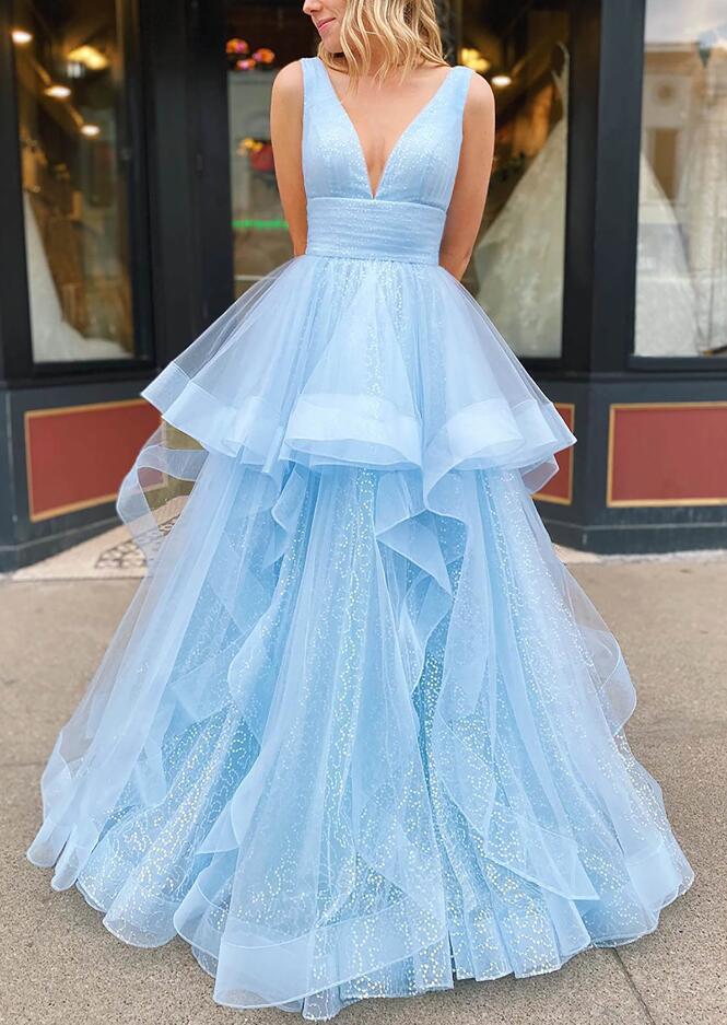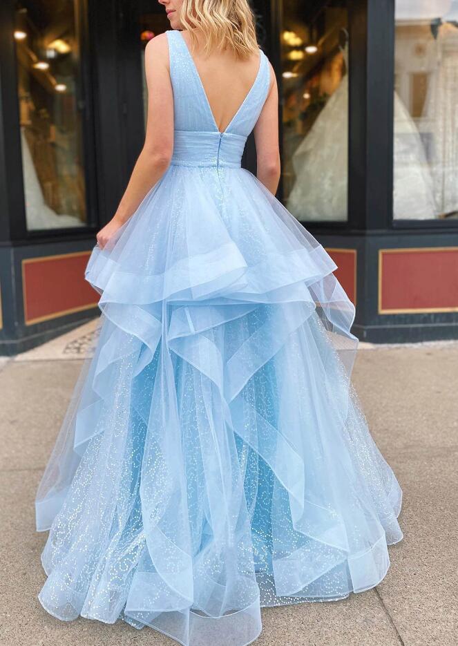 A-line Sleeveless Long V Neck Tulle Glitter Prom Dress