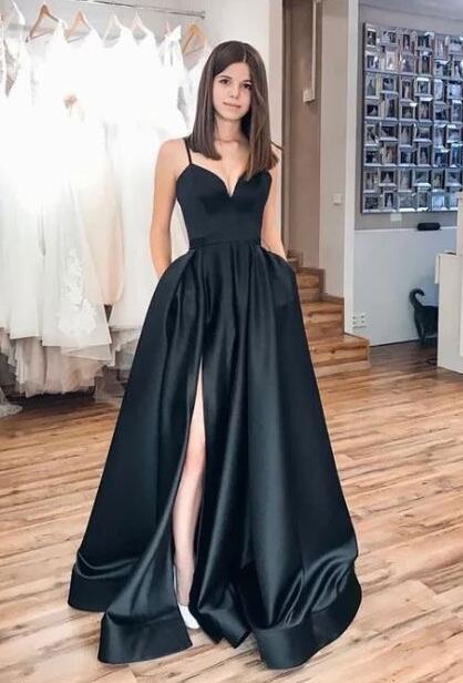 Spaghetti Straps A Line Black Prom Dresses with Slit Side