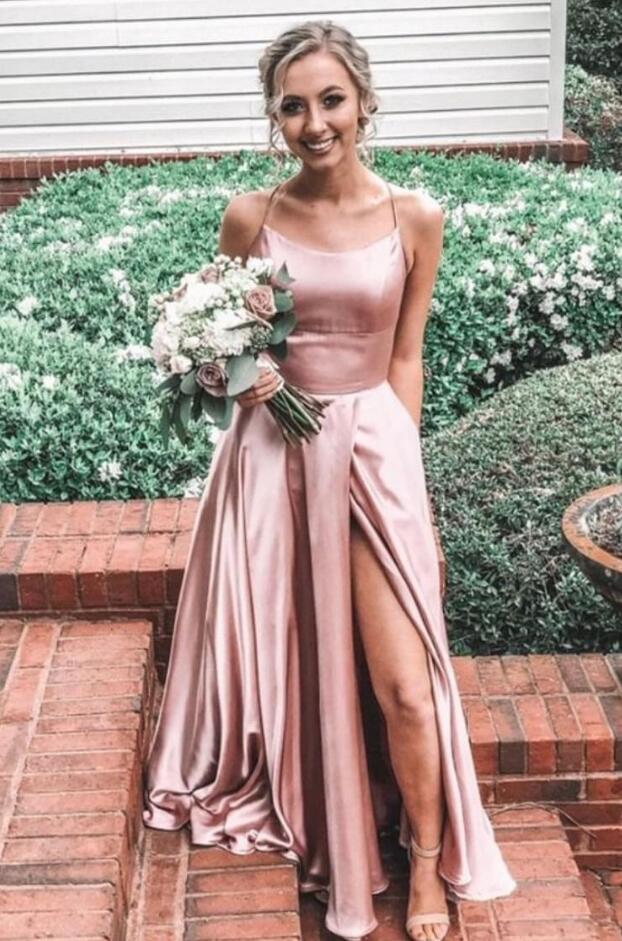 Simple Straps Pink A Line Prom Dress with Slit