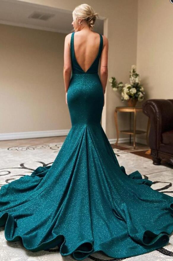 Mermaid V Neck Dark Green Prom Dress with Slit