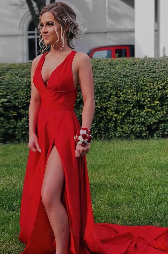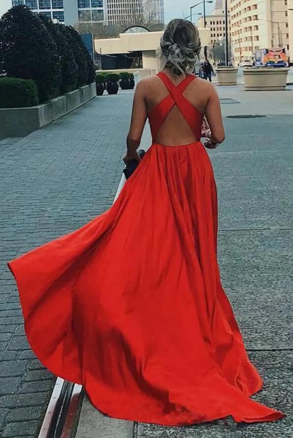 A Line V Neck Criss Cross Red Satin Prom Dresses