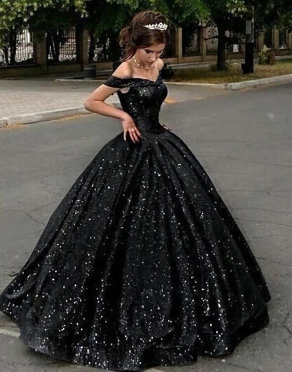 Princess Off The Shoulder Ball Gown Black Sequin Prom Dresses