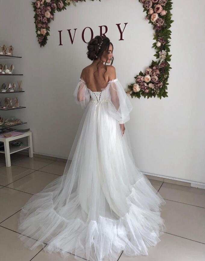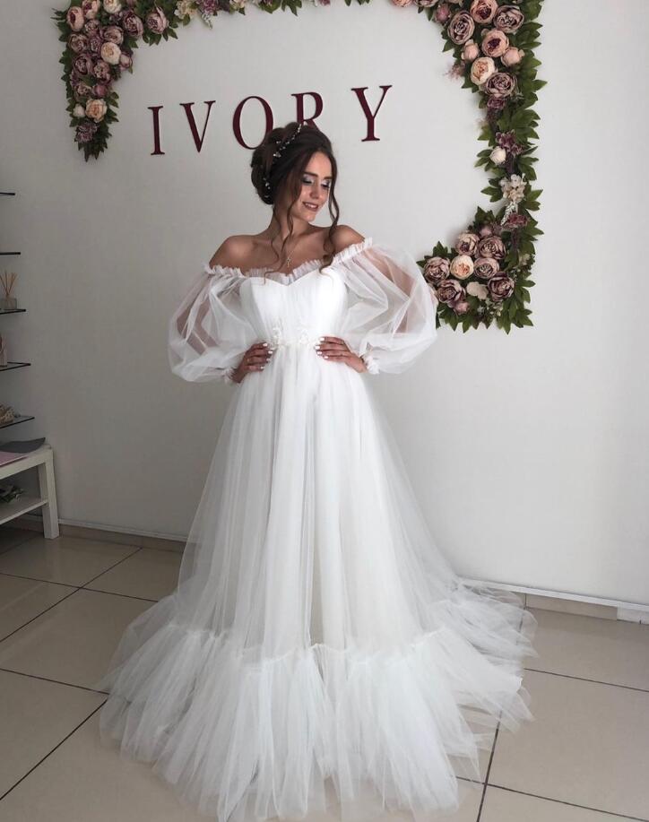 Off the Shoulder White Tulle Wedding Dress With Long Sleeves