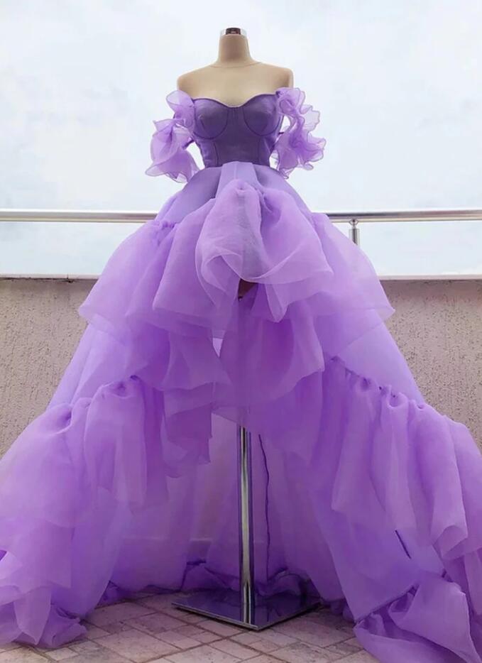Off the Shoulder High Low Purple Organza Prom Dress