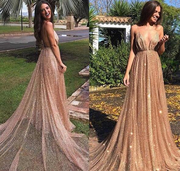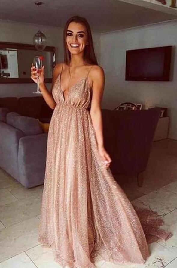 Spaghetti Straps Backless Long Sparkly V Neck Prom Dresses