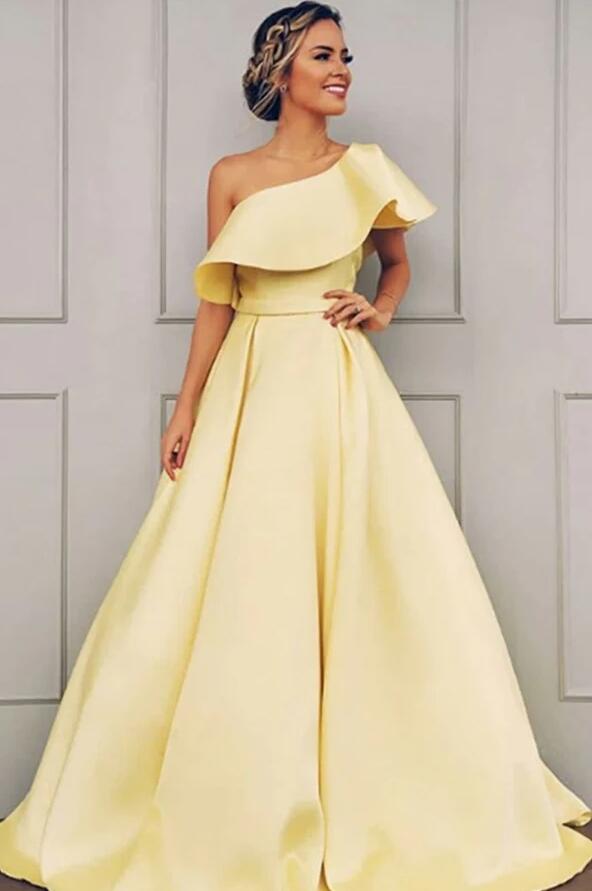 Elegant A Line One Shoulder Yellow Satin Long Prom Dresses