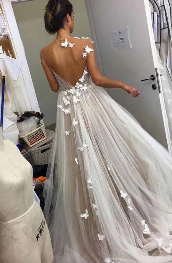 A Line Ivory Tulle Butterfly Sleeveless Long Prom Dresses