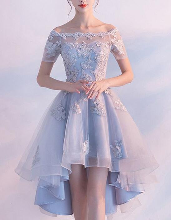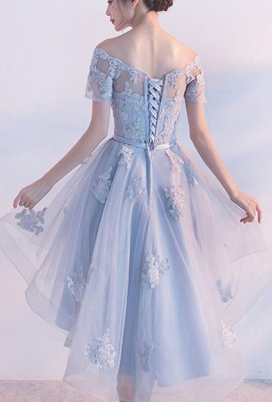 Hot Sale Short Sleeve Light Blue Prom Homecoming Dresses Lace