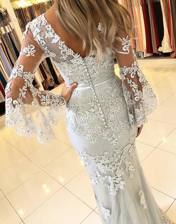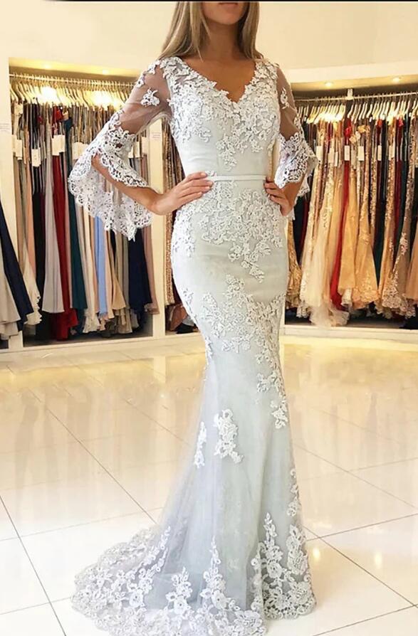 Simple A Line V Neck Lace Prom Dresses