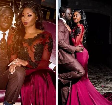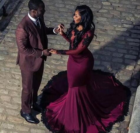 Mermaid Burgundy Sheer Long Sleeves Prom Dress With Black Appliques Lace