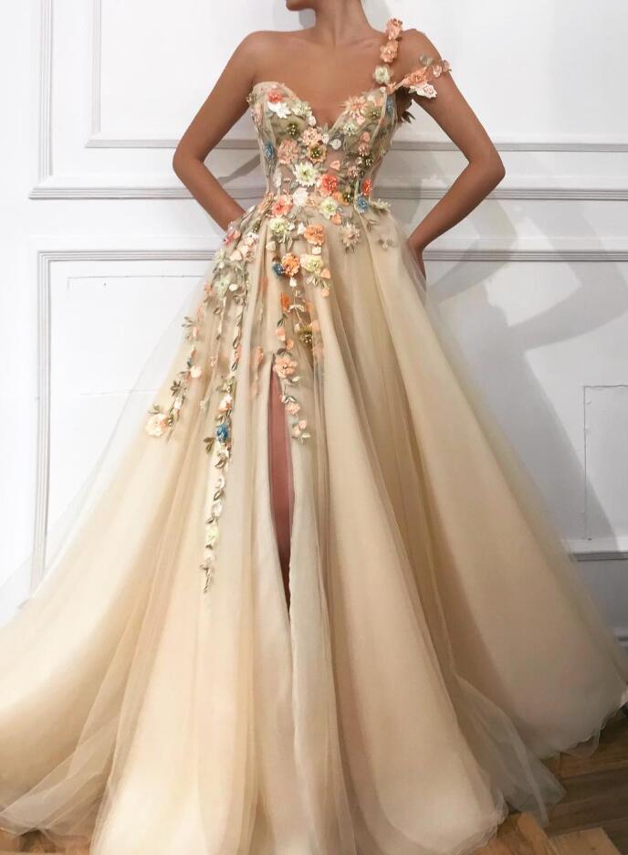 One Shoulder Romantic Slit Prom Dresses Champagne With Flowers